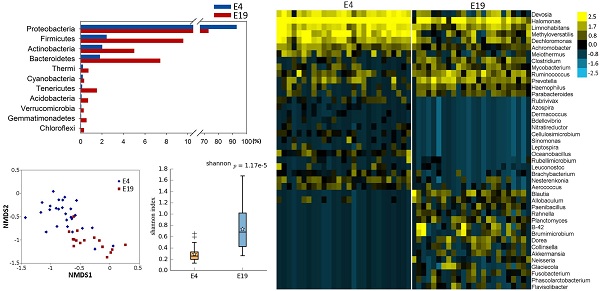 比較雞胚兩個時期(E4和E19)的微生物組,其相關系數為0.8。盡管在門水平的微生物組成較相似,但可以觀察到Proteobacteria豐度降低,而Firmicutes,Actinobacteria和Bacteroidetes豐度顯著增加;非度量多維尺度(NMDS)分析和熱圖結果顯示4日齡雞胚和19日齡雞胚腸道的微生物群落具有顯著差異,Alpha多樣性分析顯示19日齡的雞胚具有更高的微生物多樣性。