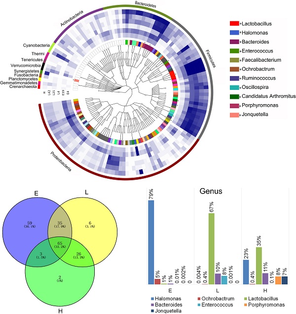 對雞胚期的51個樣品進行測序,得到的微生物分類到28個門,162個屬和76個種。在門水平上,Proteobacteria最為優勢,占總微生物豐度的86%,其次是Firmicutes(5%),Bacteroidetes(4%),以及Actinobacteria(3%);在屬水平上,Halomonas最為優勢,含量為79%,其次是Ochrobactrum,占比5%,兩者均屬變形菌門。