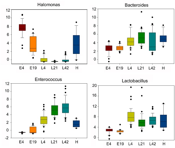 基于上述共有微生物的研究,本研究發現,共有65個核心屬貫穿于生長發育的各個時期,如Halomonas、Bacteroides、Enterococcus和Lactobacillus等。由此推測,早期胚胎定植的微生物可能遺傳自母雞,并且腸道微生物可能存在從母雞到胚胎、胚胎到小雞的傳遞過程。