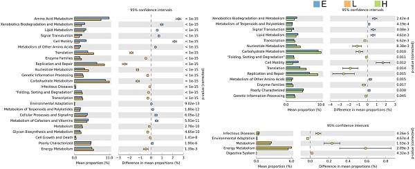 通過對菌群功能進行預測,發現有25個代謝通路在雞胚、雛雞和母雞之間存在顯著差異。雞胚腸道微生物中比較活躍的代謝通路是物質代謝、細胞運動、信號轉導、細胞信號處理、輔酶因子和維生素代謝等,這些途徑大多都與生長和發育有關。和雞胚相比,雛雞和母雞的微生物更多地參與到轉錄、翻譯、DNA復制和修復、核苷酸代謝、遺傳信息處理、碳水化合物代謝等方面的功能。雛雞和母雞的代謝途徑差異較少,表明盡管它們的腸道微生物組成不同,但功能類似。