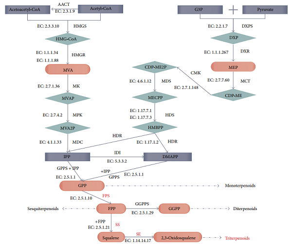 絞股藍的主要有效組成是絞股藍皂苷,它有多種多樣的生物活性,這可以解釋絞股藍為什么會在天然藥學中有廣泛應用。例如,絞股藍皂苷可以通過增加胰島素降低血糖。還有其他功能應用像抗癌,抗炎癥,抗焦慮,降血脂,保護肝細胞,神經保護和免疫保護等等。三帖合成途徑可以分解為三個部分:1、IPP(異戊烯基焦磷酸)或者DMAPP(二甲基烯丙基焦磷酸酯)合成;2、鯊烯合成和環化;3、功能化反應獲得鯊烯復合物(圖1)。和人參皂苷一樣,絞股藍皂苷在藥學和健康學中有很多重要應用。但是絞股藍皂苷和人參皂苷相比,有更高的異質性,其中有超過169種絞股藍皂苷。絞股藍比人參中的三萜化合物種類高出5倍。這可能和三帖合成途徑中的基因與酶的差異表達相關。