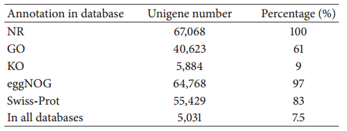 用NR,GO,KEGG,eggNOG和Swiss-Port數據庫注釋unigenes。整體看來,eggNOG中鑒定率最高,達到96.57%,KEGG中鑒定率最低,只有8.77%。