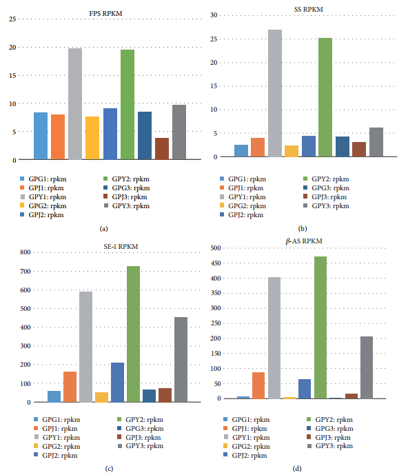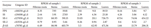 在unigene功能注釋,RPKM表達量統計和絞股藍含量測定之后,分析unigene表達,酶(unigene的產出物)的表達和絞股藍皂苷的含量分布之間的關聯,發現unigene和酶的表達與皂苷含量分布呈正相關。也就是說樣本(纖維根,莖,葉片)中unigene和酶(FPS,SS和SE)的表達取決于皂苷含量的分布。這一結論,有利于絞股藍中其他次級代謝產物的深入研究。