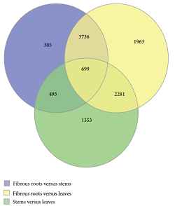 統計unigene的RPKM,做RPKM的密度分布圖。發現中等范圍表達量的unigenes的AUC(曲線下面積)占絕大部分,低表達或者高表達的unigenes的AUC是少部分的(圖2)。通過密度分布圖發現,纖維根中的unigenes要比莖和葉片中的unigenes表達量高。盡管莖和葉片有相似的unigene表達量,莖中的表達量稍微高于葉片中的表達量。另外分析編碼FPS,SS,SE和β-AS(β-香樹精合成酶)的unigenes的表達,發現這些unigenes在葉片中高表達,在纖維根中低表達,在莖中要比纖維根中表達量高。編碼β-AS的unigene在葉片中的表達量是纖維根中的將近125倍。通過DESeq軟件做兩兩比較分析測序數據,通過韋恩圖展現出差異表達的unigene的分布情況(圖3)。