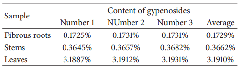 分光光度法測定絞股藍的皂苷含量分布。所有的樣品中葉片的皂苷含量最高(3.189%),在莖(0.365%)或者纖維根(0.172%)中皂苷含量比較低。