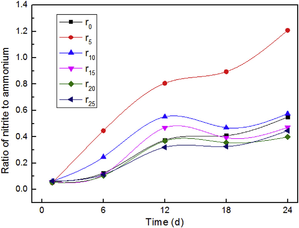 在短程硝化(PN)過程中,亞硝酸鹽與銨鹽的比值越大,表明硝化作用越強,反之越弱。不同磁場強度下,亞硝酸鹽與銨鹽的比值隨時間的變化曲線如下圖所示。結果表明,磁場的存在對短程硝化具有顯著影響,磁場強度為5mT時,硝化作用最強;然而,隨著磁場強度的增強,硝化作用越來越弱。由此可知,短程硝化的最適磁場強度為5mT。