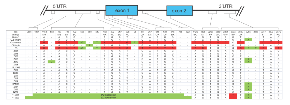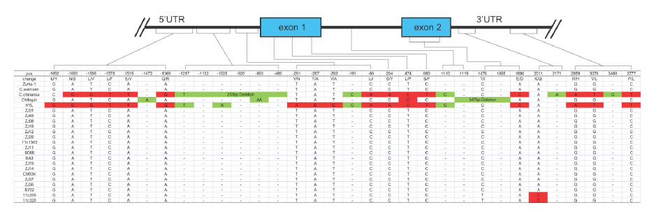 以AT3為例,在辣椒中鑒定了3個At3(Pun1)的串聯拷貝,編碼假定的酰基轉移酶且在某些辣椒屬植物中對辣度起調控作用。野生和栽培辣椒中AT3-D1和AT3-D2均在保守的DFGWGKP結構域有氨基酸替換。對AT3-D1的分析表明(圖2),在非辛辣基因型中,pun1等位基因(C位點)有2724/2930bp的缺失,橫跨假定的啟動子區和第一外顯子。在辛辣的辣椒品種中,AT3-D1和AT3-D2(圖3)同樣鑒定到了短InDel和單堿基非同義替換。