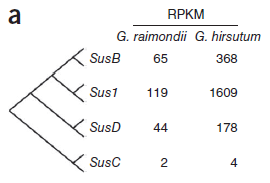 鑒別到的4種蔗糖合酶(Sus)基因中,3種(SusB、Sus1和SusD)在陸地棉中表達量大幅高于雷蒙德氏棉。(圖5)