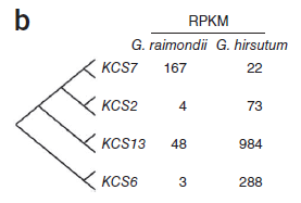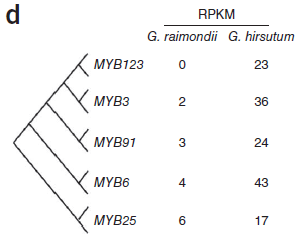 這篇2012年的Nature Genetics文章通過對開花后3天(DPA)胚珠的轉錄組測序,在無纖維的雷蒙德氏棉和有纖維的陸地棉之間發現了關鍵成纖維基因的轉錄本的定量差異,包括Sus、KCS、ACO、MYB和bHLH基因。