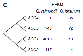 相對的,編碼1-氨基環丙烷-1-羥酸氧化酶(ACO)的轉錄本在雷蒙德氏棉存在極端高含量,表明乙烯在纖維細胞發育早期有重要作用。(圖7)
