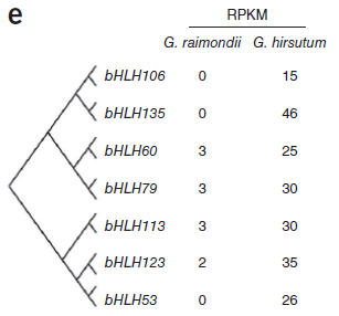 此前研究提出假設,即棉纖維在形態和起源上與植物表皮毛相似,表皮毛為多種植物組織中存在的毛狀表皮細胞,常見于葉片和莖表面。假設提出,在擬南芥表皮毛發育中起重要作用的轉錄因子可能與棉纖維形成相關。在擬南芥中,MYB和bHLH類轉錄因子與TTG1形成復合物共同起作用調控表皮細胞發育。總計2706個轉錄因子,包括208個bHLH和219個MYB基因在雷蒙德氏棉基因組中得到鑒定。大量的MYB和bHLH基因在陸地棉胚珠中顯著表達,而雷蒙德氏棉胚珠中只有殘量表達,表明這些基因的部分可能為纖維早期發育所必需。(圖8)