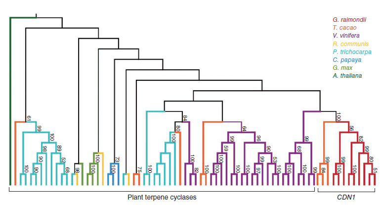 這篇文章同樣對棉子酚生物合成基因進行了鑒定和進化分析。棉會產生一種獨有的萜類,包括脫氧半棉酚、半棉酚、棉子酚、半棉酚酮、殺實夜蛾素。棉植株在色素腺體中積累棉子酚及相關倍半萜類來防御病蟲害。大部分棉倍半萜類都有一個共同前體衍生出來,(+)-δ-杜松萜烯,由(+)-δ-杜松萜烯合酶(CDN)通過法尼基二磷酸的環化作用合成,是棉子酚生物合成的第一個關鍵步驟。以前,CDN-A和CDN-C均被報道編碼CDN酶活性。利用雷蒙德氏棉和其他8種有參物種的進化分析表明,除了水稻,萜環化酶基因家族為多種植物所共有。然而,只有雷蒙德氏棉和可可(同屬錦葵目Malvales)擁有具生化功能的CDN1基因家族。似乎棉子酚合成能力與古六倍體和全基因組倍增事件均相關相關。在近緣分支的番木瓜和毛果楊中沒有發現CDN1的同源基因,表明棉子酚的產生是在這些物種分離之后出現的。DDtYD和DDVAE結構域是棉子酚生物合成的關鍵因素,其他植物萜環化酶基因不編碼含DDVAE結構域的蛋白因此不屬于CDN同源基因。