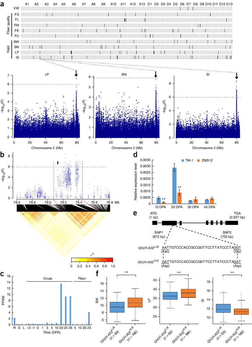 在75.90-76.05Mb的LD連鎖區域內鑒定到一個候選基因——GhXIK,該基因編碼XI-K肌球蛋白家族的一個成員,該基因在纖維伸長和次生細胞壁合成過程中高表達。非同義突變導致1,011位的丙氨酸突變為纈氨酸,這與棉纖維長度、纖維強度的增加以及棉纖維的整齊度提高顯著相關。在3個與黃萎病抗性相關基因座附近,鑒定到一個編碼疾病抗性相關蛋白的候選基因。