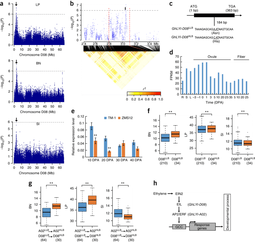 通過多種分析方法相結合,鑒定到了與多個農藝性狀相關聯的兩個基因座,它們與棉花衣分、株鈴數的增加和籽指降低有顯著相關性。在位于A02染色體上的基因座附近,鑒定到了候選基因AIL6,該基因與擬南芥ERF型轉錄調控因子同源,轉錄組數據表明AIL6在花后20至25天高表達。qRT-PCR分析結果表明AIL6在TM-1中的表達量是在改良種ZMS12中的10倍;另一個是位于D08染色體2.8-3.0Mb區段內的EIL基因,該基因在TM-1和ZMS12中差異表達,qRT-PCR分析也再次驗證了該結果。