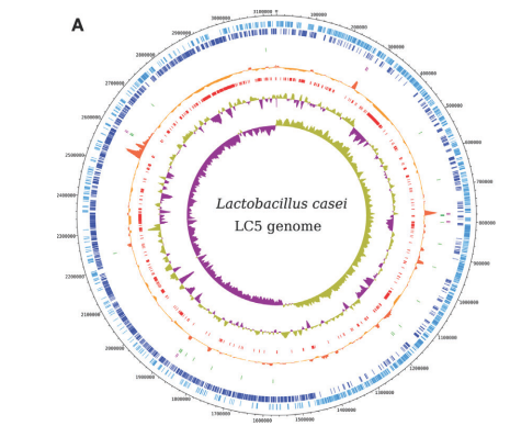 益生菌是我們腸道中的“原著居民”,維持著腸道內免疫系統的平衡與穩定。在漫長的研究歷史中發現,益生菌在治療和預防腹瀉、腸炎性疾病和部分免疫疾病上具有一定的作用。最近的研究也發現,乳桿菌和雙歧桿菌還可以對一些心理障礙患者起到治療作用。今天,我們的主角是干酪乳桿菌Lactobacillus casei,它是一種非常常見的益生菌,常用于食品發酵行業,與嗜酸乳桿菌和雙歧桿菌并稱為“健康三益菌”,一直是益生菌功能研究的重點對象。最近,在《Frontiers in immunology》(影響因子6.429)上發表了一篇關于干酪乳桿菌全基因組測序的文章,闡述了益生菌L. casei LC5的相關基因信息。