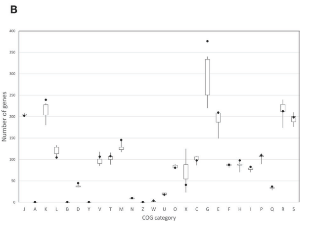 通過與19個L. casei基因組的COG功能比較發現,L. casei LC5在G和K兩個功能分類上,擁有的蛋白數量明顯高于其它基因組,分別代表碳水化合物轉運與代謝和轉錄相關功能。