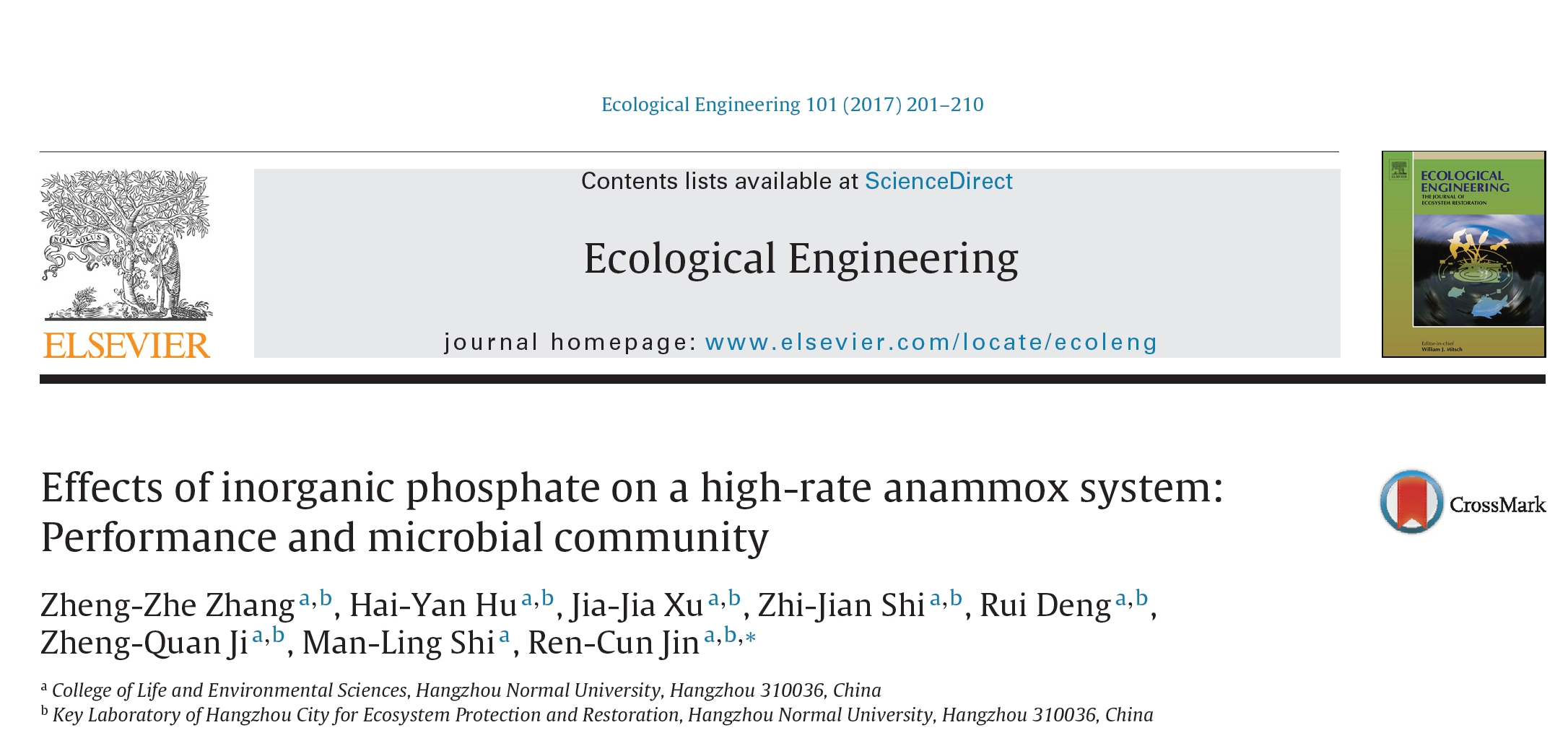 Zhang Z Z, Hu H Y, Xu J J, et al. Effects of inorganic phosphate on a high-rate anammox system: Performance and microbial community[J]. Ecological Engineering, 2017, 101:201-210.