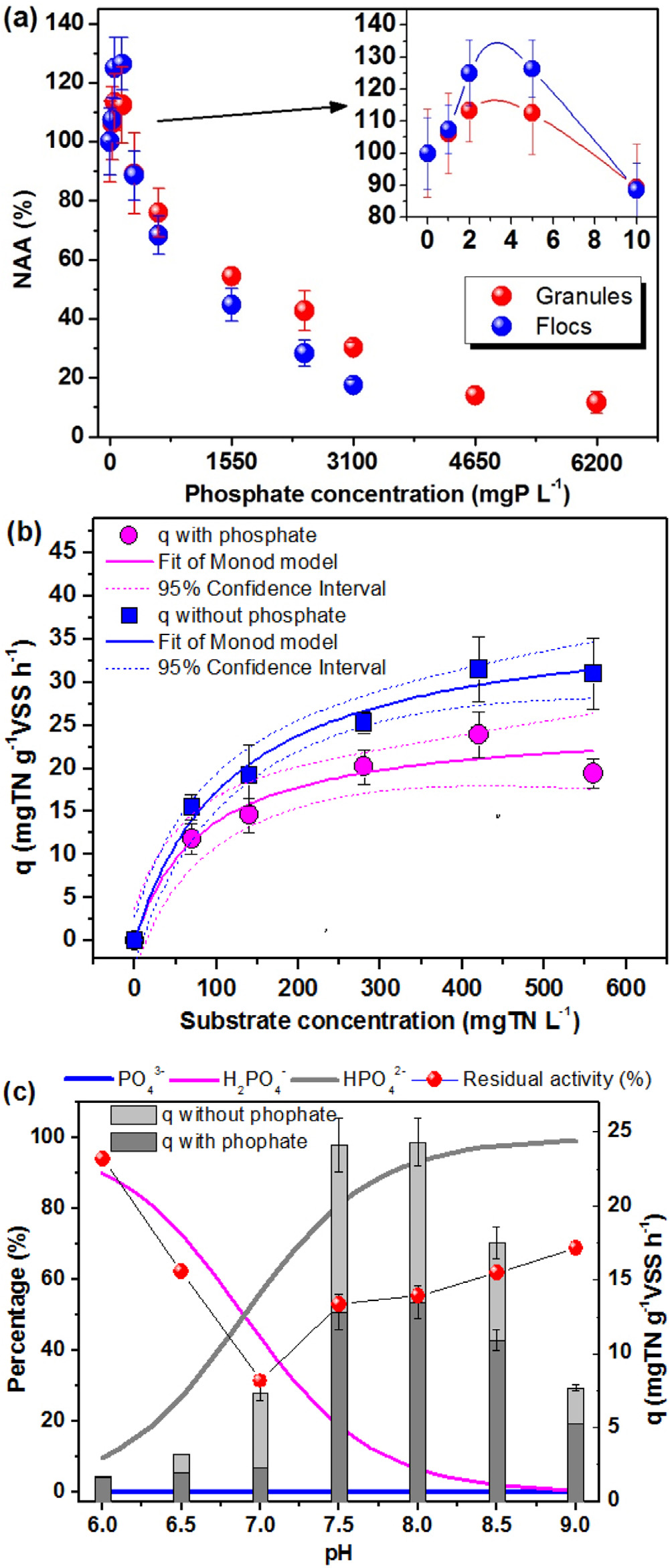 圖a中將厭氧氨氧化顆粒與污泥絮體物作為研究對象,觀察不同濃度磷酸鹽對厭氧氨氧化反應的急速反應,其中顯示當磷酸鹽濃度在62與155 mg P/L時,絮體物對于厭氧氨氧化活性影響可提升超過20%,但當磷酸鹽濃度高于620 mg P/L時,顆粒和絮體物的反應活性均顯著抑制;圖b為磷酸鹽存在與否對于厭氧氨氧化活性動力的影響,其中顯示當反應器中存在磷酸鹽,可以加強酶對底物的親和力,同時厭氧氨氧化顆粒表現出更好對于磷酸鹽表現除了更大的耐受性;圖c為不同形式的磷酸鹽對于反應器的影響,其中主要取決于磷酸鹽的PH值,HPO42-在弱酸性條件下影響顯著,而H2PO4-在弱堿環境中主導抑制作用.