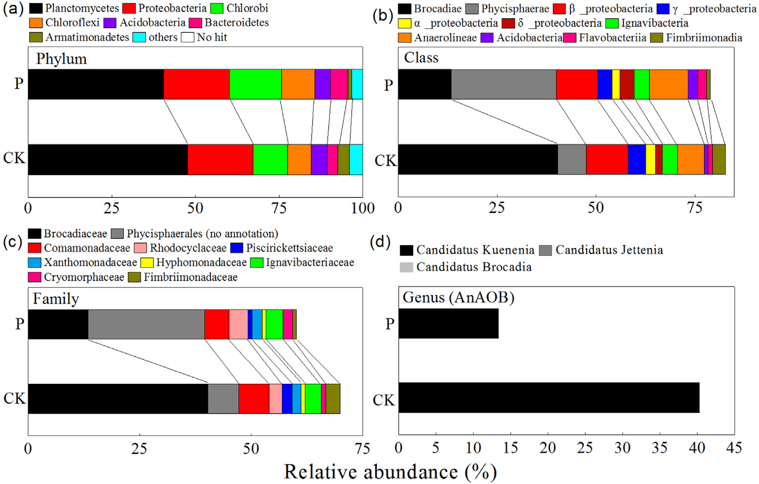 多樣性指數統計結果顯示試驗組樣品的多樣性及物種豐富程度均低于對照組樣品;另外從豐度>1%的各水平微生物類群統計結果可以看出,Proteobacteria與Acidobacteria豐度沒有顯著變化;同時添加磷酸鹽的試驗組Brocadiae顯著降低,但Phycisphaerae顯著增加,這樣的物種變化趨勢在科分類單元中同樣出現。