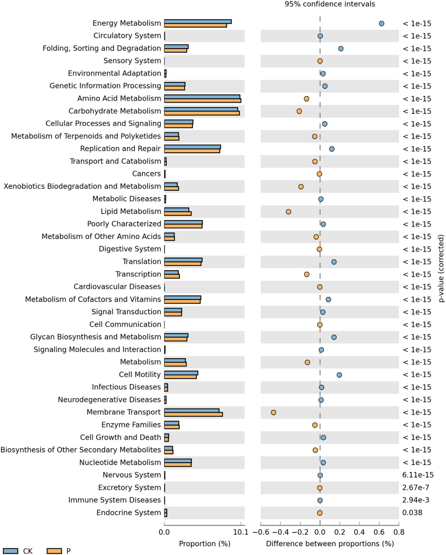 代謝功能預測結果顯示碳水化合物代謝與氨基酸代謝途徑豐度值高于其他代謝功能,表明這兩個代謝途徑的特殊重要性;另外試驗組樣品能量代謝豐度要顯著低于對照組樣品,而膜轉運相關途徑豐度要顯著高于對照組;同時基于厭氧氨氧化顆粒物反應器在進行厭氧氨氧化的過程中也發揮著厭氧、發酵、脫氮等作用。