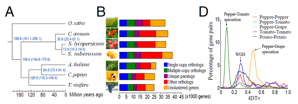 采用OrthoMCL方法進行基因家族的種間比較(辣椒、番茄、馬鈴薯、擬南芥)構建單拷貝同源基因的系統進化樹,發現在36Mya辣椒與番茄、馬鈴薯分離,即茄科辣椒屬形成,期間發生了辣椒染色體易位、倒位等變異,156Mya茄科出現,緊隨著單、雙子葉植物的分離。與葡萄比較發現了辣椒基因組三倍化,這可能是茄科的共同事件,但三倍化后出現了基因拷貝的丟失。通過4DTv方法計算WGD時間,WGD峰出現在0.3位置。