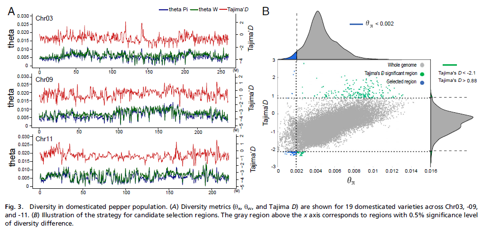 辣椒馴化研究選擇了18個栽培品種和2個野生/半野生品種,通過遺傳瓶頸法鑒定人工選擇標記,通過θπ、θω值檢測遺傳多樣性降低鑒定了115個人工選擇區域(含511個基因),其多態性水平顯著降低,相關基因功能涉及轉錄調節、脅迫與防御響應、蛋白-DNA復合物裝配、生長和果實發育等,與栽培種與野生種的形態和生理差異相關。