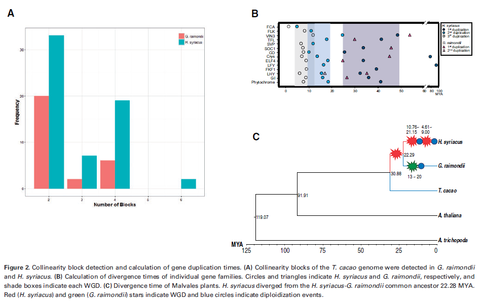 MCScanX檢測共線性模塊,以可可樹基因組為模板,檢測木槿和雷蒙德氏棉的共線性模塊,發現木槿共線性模塊的數目是雷蒙德氏棉的4倍,大小為其2倍,表明木槿中出現過WGD。系統發育分析揭示基因組復制模式,GI、CONSTANS和SOC1等基因復制表明木槿中出現了3次WGD,但很多基因在第一次復制后出現丟失。