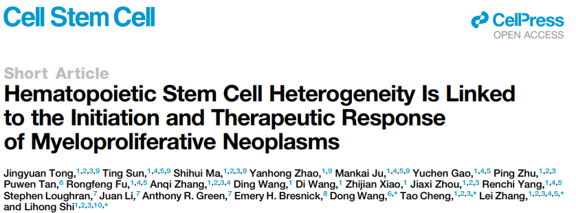 為了回答上述難題,2月22日,來自中國醫學科學院血液病醫院的石莉紅/張磊/程濤團隊聯合南方醫科大學王棟團隊在Cell Stem Cell在線發表了題為“Hematopoietic stem cell heterogeneity is linked to the initiation and therapeutic response of myeloproliferative neoplasms”的研究性文章。該研究首次闡述了造血干細胞的異質性是如何影響血液腫瘤(MPN)的發生發展,同時也為其它類型的血液腫瘤研究提供了參考。