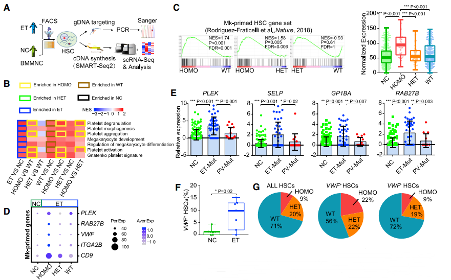 為了探究一種突變為何導致不同的疾病表型,研究人員對來自10例ET、5例PV患者以及7例健康供者的造血干細胞(Lin-CD34+CD38-CD45RA-CD123-)進行了全轉錄組測序。生信分析結果顯示來自不同狀態的HSC的數據能夠較好地被區分開。在隨后的分析中,他們發現VWF基因在ET-HSC中高表達,VWF是具有巨核細胞傾向的造血干細胞的標志性基因。因此,研究人員推測:ET患者的造血干細胞更具有巨核細胞分化傾向,這與該疾病的發生發展可能也存在較大的關聯。后續的實驗也同樣證實了上述假設,即ET患者造血干細胞的增殖和巨核細胞分化潛能更強,這種現象在PV患者中卻不存在。