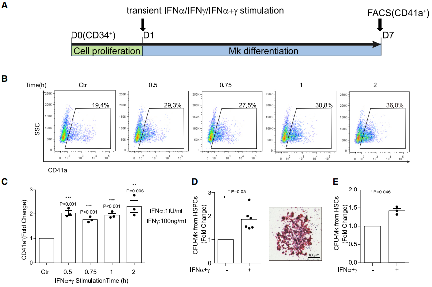 上述內容通過單細胞測序數據和生物信息學分析等方法得出了IFN對ET-HSC向巨核細胞分化及產生血小板的正向調控。隨后,為了驗證IFNa 和IFNg 信號對ET的影響,他們利用臍帶血CD34+造血干細胞(HSPCs)分析了IFN刺激對巨核細胞分化的影響。實驗結果表明,聯合IFNa、IFNg 刺激(0.5-2 h)會協同促進CD41a+巨核細胞的分化,而且IFNa + IFNg刺激后產生的巨核克隆的體積也更大。