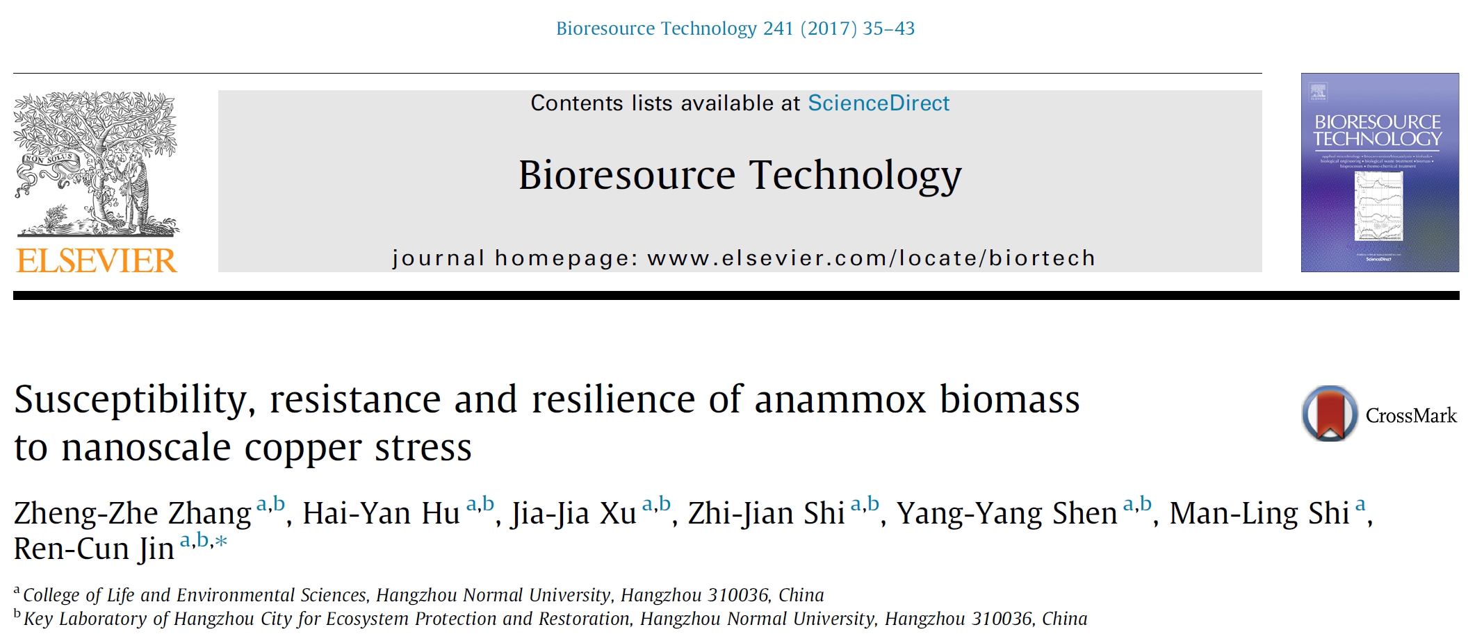 Zhang Z Z, Hu H Y, Xu J J, et al. Susceptibility, resistance and resilience of anammox biomass to nanoscale copper stress.[J]. Bioresource Technology, 2017, 241:35.