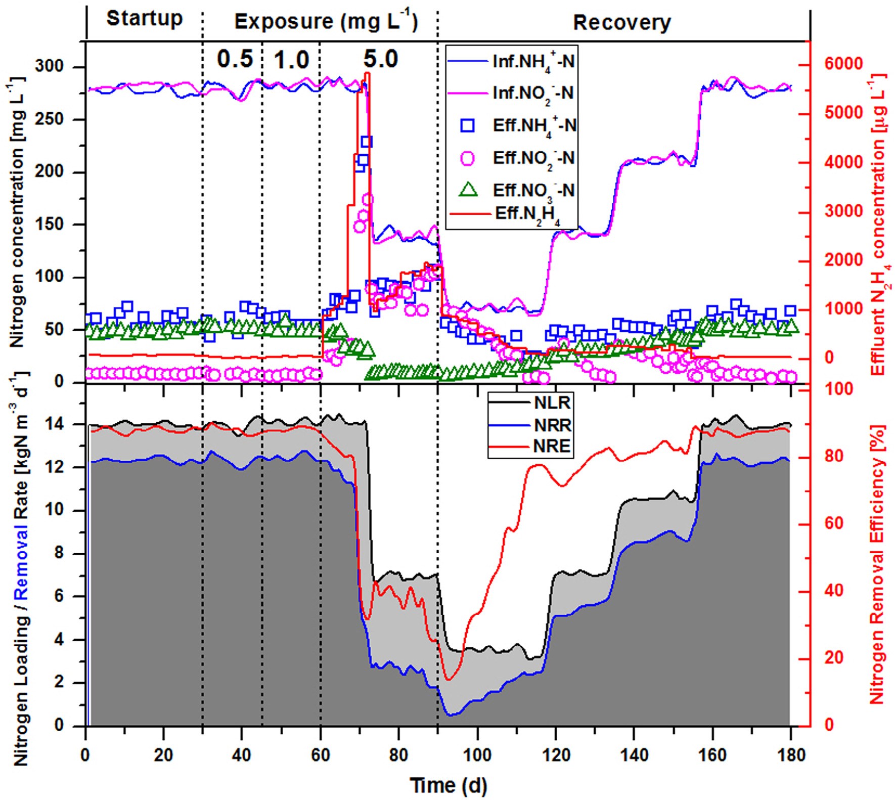 在反應器中成功接種厭氧氨氧化顆粒后,反應器成功啟動,并顯示了良好的脫氮效率;隨后在實驗的31天加入納米銅進行脅迫反應,但從0.5 mg/L到1.0 mg/L濃度變化來看,并沒有顯著影響厭氧氨氧化過程;直到將納米銅濃度增加到5.0 mg/L后,反應器的脫氮性能隨著時間變化迅速惡化,在第72天,反應器中的NH4+-N與NO2—N迅速增加,脫氮效率急劇降低;而在除銅恢復過程中,厭氧氨氧化反應器的脫氮性能逐漸恢復