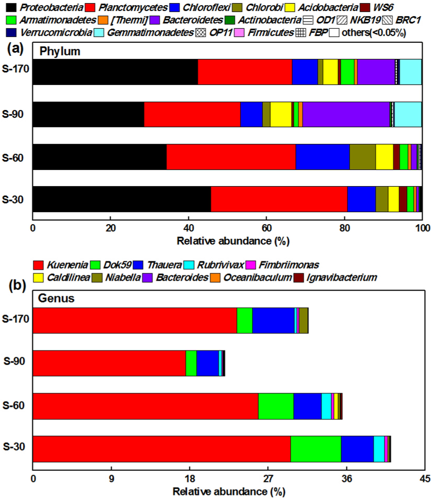 用于檢測微生物多樣性菌落的樣本分別采集于30、60、90、170天,從分析數據結果可以看出,菌群豐富度指數與多樣性指數均隨著納米銅含量的不斷提高而增加;隨著納米銅濃度增加到5.0 mg/L,Proteobacteria, Planctomycetes, WS6, OD1與 NKB19相對豐度降低,Acidobacteria, [Thermi], Bacteroidetes, BRC1, Verrucomicrobia, Gemmatimonadetes與FBP相對豐度增加,而Armatimonadetes, Actinobacteria, OP11與 Firmicutes相對豐度在納米銅濃度低于1.0 mg/L是呈增加趨勢,但隨著濃度增加至5.0 mg/L時呈減少趨勢