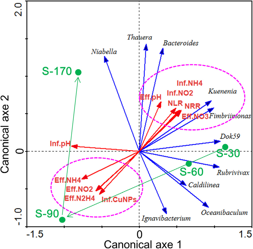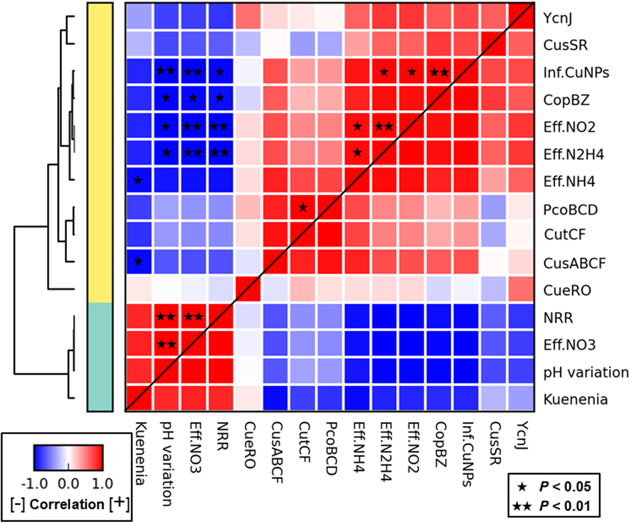 Pearson相關性分析揭示納米銅對脫氮性能的影響,圖中紅色區域表示兩個因子之前呈正相關,藍色區域呈負相關,其中,Inf.CuNPs與Kuenenia呈負相關趨勢,Eff.NO3與NRR呈負相關趨勢,但與Eff. NH4、Eff.N2H4呈正相關趨勢,這些均與RDA分析結果相吻合;另外Inf.CuNPs與抗銅基因CusABCF、CusSR、CopBZ、PcoBCD均呈正相關關系,表明隨著納米銅濃度逐漸增加,其抗銅機制也在不斷增強。