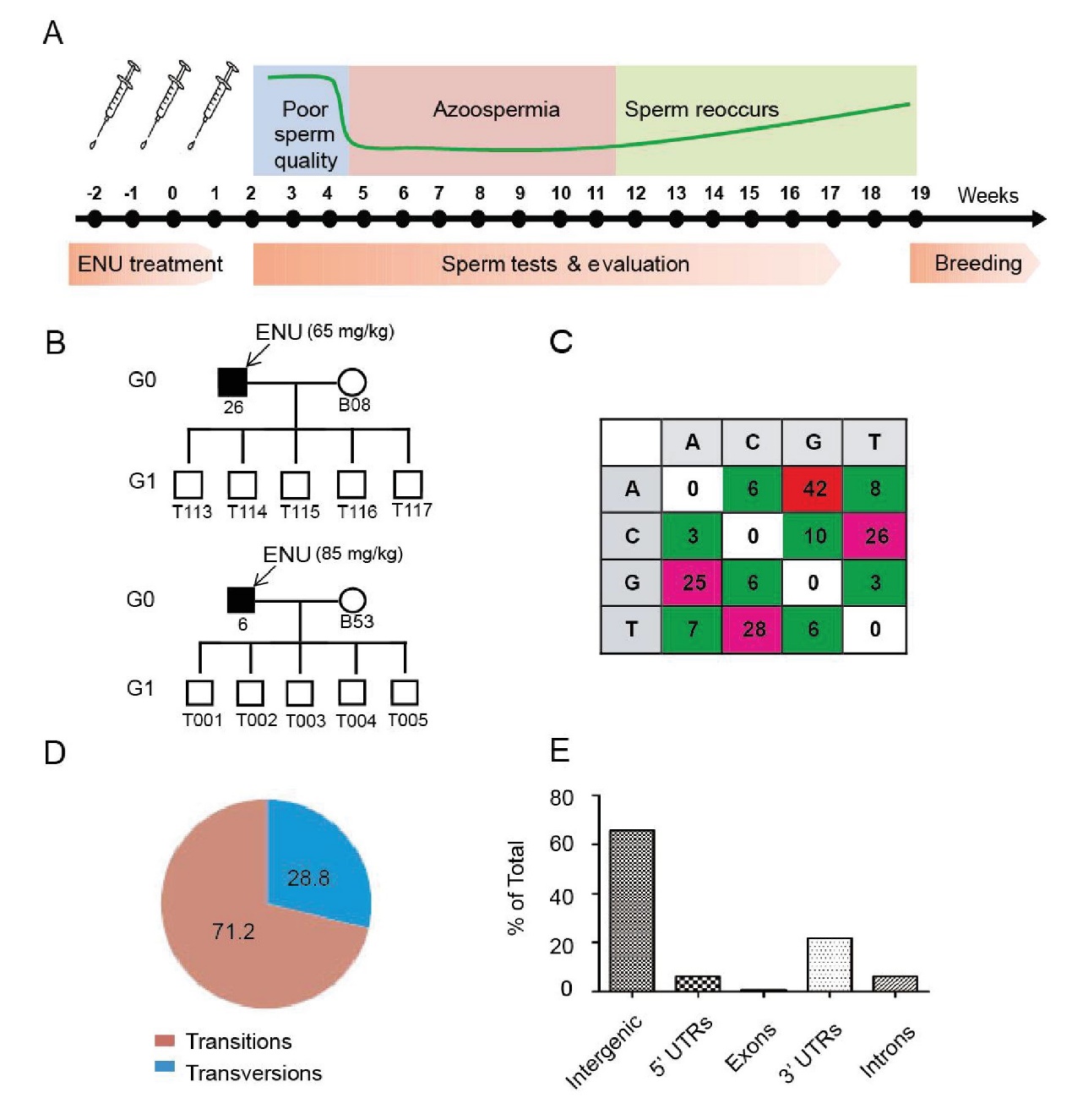 對ENU在巴馬豬的全基因組水平引起的突變頻率進行研究,發現經ENU處理產生的主要變異形式為堿基轉換和顛換,其中堿基轉換頻率(71.2%)顯著高于顛換(28.8%)。經統計,平均每個GI代攜帶4500-16,458個雜合突變,并且大多數位于基因間隔區。此外,通過對ENU的誘變劑量進行考察,得出能引起有效突變的合適劑量為3×85 mg/kg ENU。
