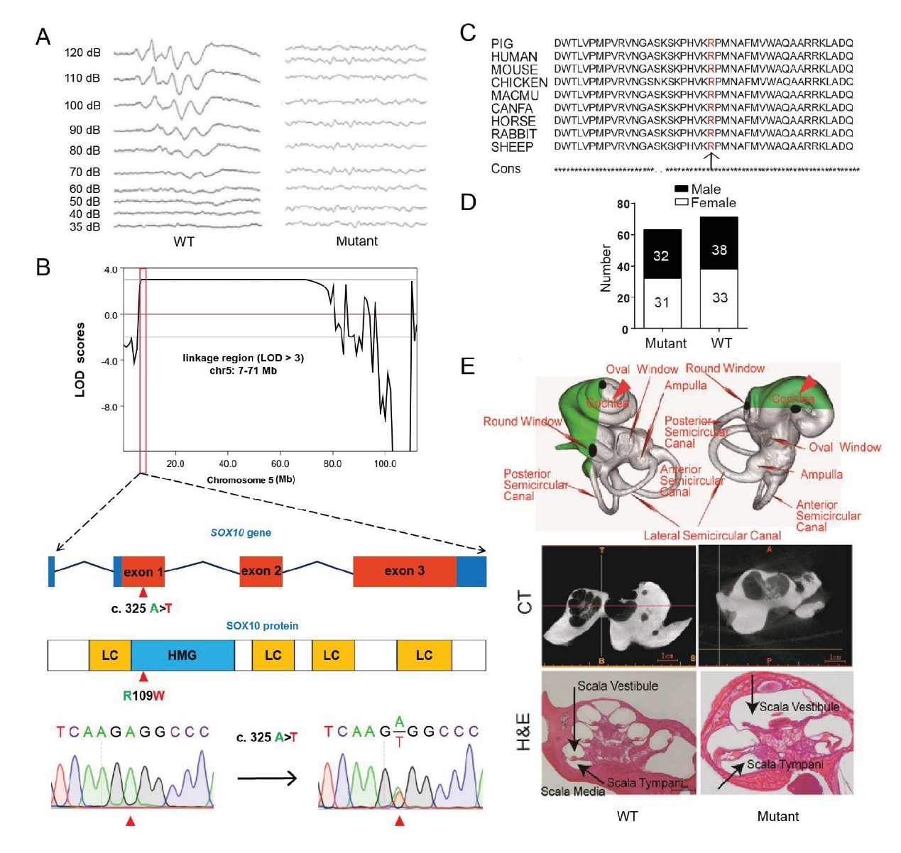 研究發現突變體TBB007T095聽覺嚴重受損,與人Mondini內耳畸形疾病病理表型高度相似。通過GWLS分析在5號染色體(7-71 Mb)上發現一個顯著的遺傳連鎖區域,并在該區域中分離到了色素衰退相關基因SOX10,該內耳畸形突變體的致病位點被精確定位為SOX10基因第109位氨基酸的改變 (R109W)。推測SOX10基因可能是Mondini內耳畸形的致病基因,且該突變體可作為人Mondini內耳畸形疾病的首個大動物模型。