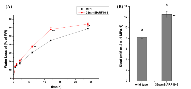 圖1,過表達mSlARF10增加了葉片失水。a:葉片失水率,b:葉片導水率