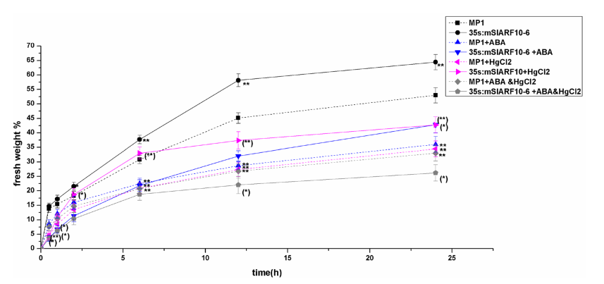 2、用ABA(脫落酸)和HgCl2做預處理,驗證在35S:mSlARF10中有較高的導水率,這和其有較大的氣孔和較高活性水通道蛋白相關(AQPs)。ABA處理的條件下,35S:mSlARF10-6有著較高的敏感性,氣孔會迅速關閉。在WT的0-24h的脫水處理中,內源性ABA的積累逐漸增加。ABA敏感性實驗檢測SlARF10是否和ABA信號傳導相關。在35S:mSlARF10-6和WT葉片中,ABA處理可能減少了失水(圖2)。ABA處理的35S:mSlARF10-6中葉片的失水很大程度的下降,將近20%。ABA處理的WT的葉片失水量在脫水處理6h后,比脫水處理6h前還低。35S:mSlARF10-6中失水速度比WT中要高,但是ABA處理后,在脫水處理6h前要比WT中要慢很多。這表明在早期的脫水處理中,ABA在35S:mSlARF10-6葉片中對失水的抑制作用要比WT中要大。