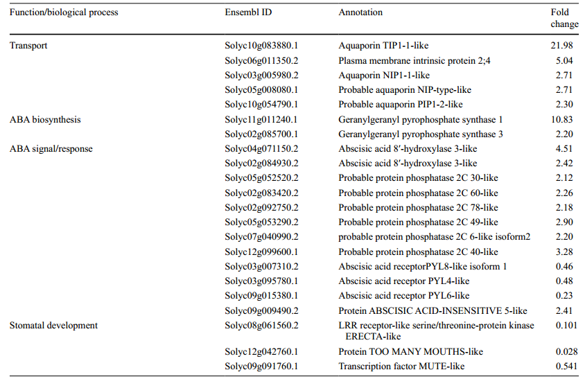 表1,葉片中差異性上調的AQPs,ABA和氣孔發育相關的基因