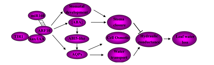 構建互作反應的網絡圖,說明miR160在ARF10在植物水壓環境中的調控作用中的精確作用(圖3)。該模式說明ABA-植物生長素相互作用對控制失水的影響。當生長素信號被激活,Aux/IAA被分解,ARF10被高水平轉錄。盡管ARF10可以通過ABA合成基因活躍的表達增強ABA含量,通過ABI5表達增強ABA信號,最后導致干旱是氣孔關閉。適當表達水平受miRNA160調控的ARF10,可能在葉片發育中維持葉片水平衡和適應水壓中有著重要的作用。