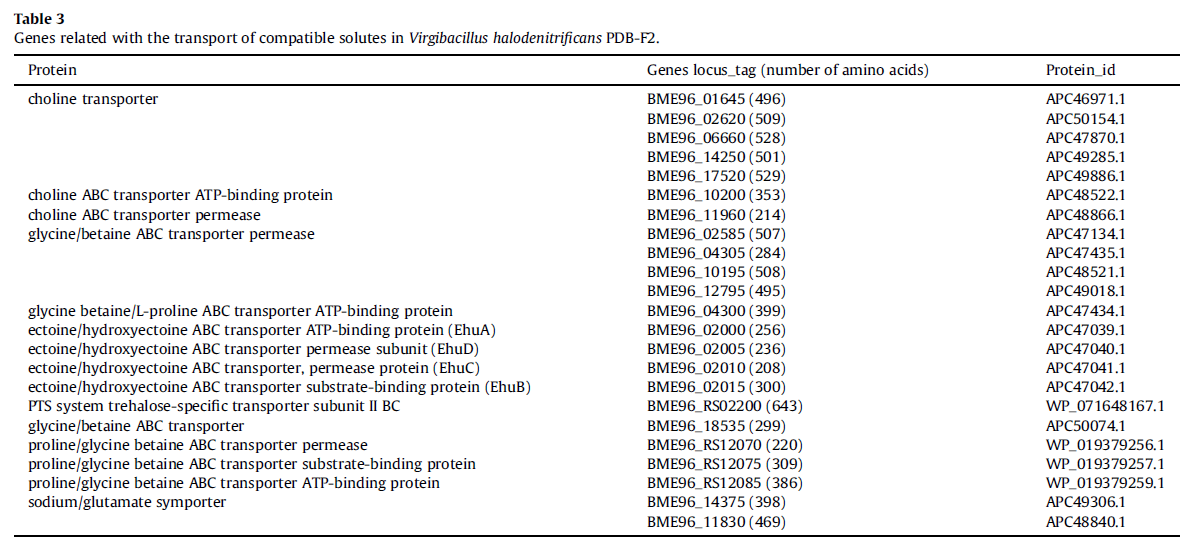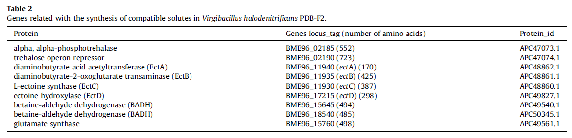 Y Zhou,ZY Sun,H Li,CJ Qian,X Wu,HZ Tang,Fawad Ali,and YD Liu,(2017). Investigation of compatible solutes synthesis and transport of Virgibacillus halodenitrificans PDB-F2 with complete genome analysis. International Biodeterioration & Biodegradation 122 (2017) 165e172. Doi: 10.1016/j.ibiod.2017.05.005