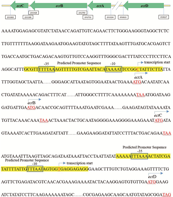 通過軟件分析觀察到,ectA(513bp)、ectB(1278bp)、ectC(387bp)、ectD(897bp)四個基因同方向排列,它們翻譯方向與在染色體中的讀碼方向相反。其中ectA與ectB、ectC距離較近,而與ectD基因序列之間相隔距離很遠(1205086bp),因此推斷ectA、ectB和ectC在翻譯過程中由一個啟動子控制,而ectD由另一個啟動子控制。該研究提示,獲得菌株全基因組序列可以對其基因構架和排列有更系統的概覽,對探究目的基因的作用機制具有重要意義。