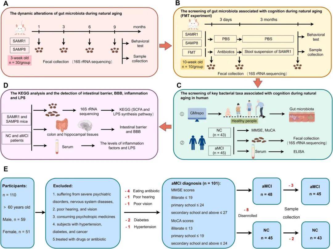 1、實驗材料與樣本采集:特定環境下飼養清潔級 3 周齡的 SAMR1 和 SAMP8 小鼠,于 1、3、6、9 月齡時收集糞便,評估認知功能后采集血清、結腸和海馬組織樣本。同時招募 60 歲以上的遺忘型輕度認知障礙(aMCI)患者和認知正常對照(NC),采集糞便和血清樣本。