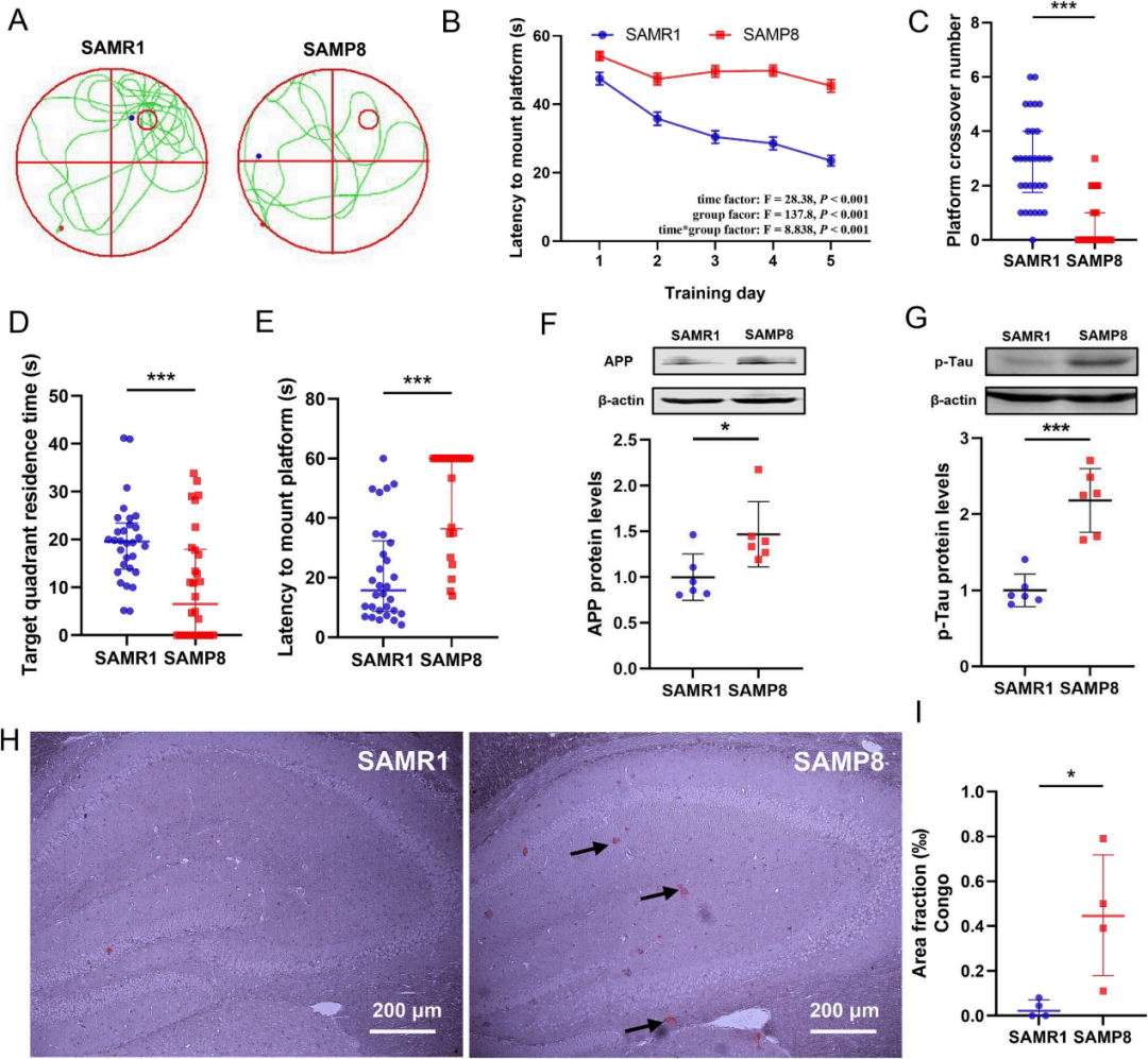 選用SAMP8 及同源對照 SAMR1 小鼠進行Morris水迷宮實驗,發現SAMP8 小鼠表現出認知障礙,且海馬體中AD病樣病理特征顯著明顯于SAMR1 (圖 2F - I),適合用于研究年齡相關的阿爾茨海默病。