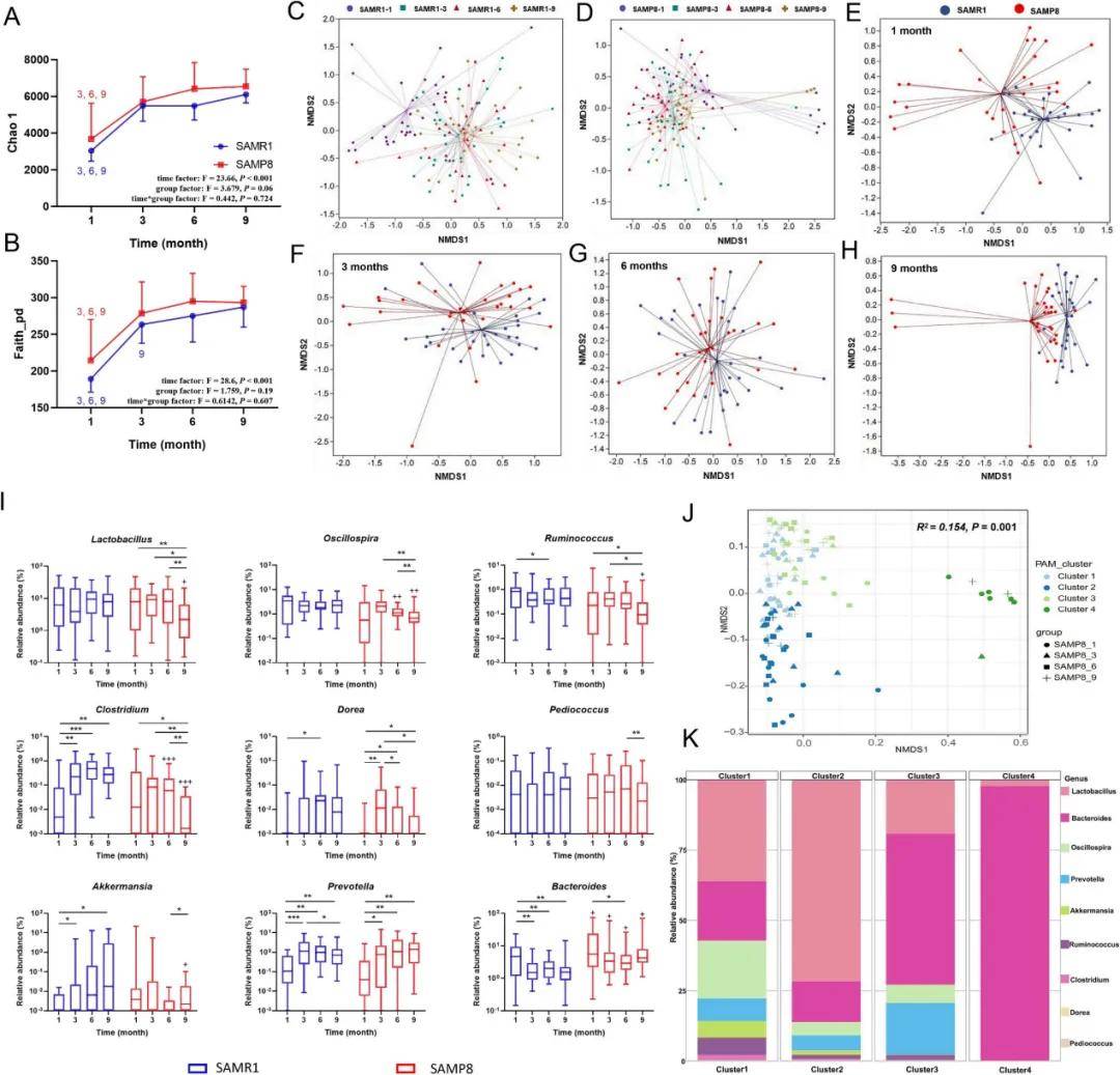 分析不同月齡的SAMR 1和SAMP 8小鼠糞便樣本測序結果,Chao1 指數和 Faith_pd 指數均隨月份同增長(圖 3A - B); β 多樣性表現為組內聚集,組間分散,在多個月齡間有顯著差異(圖3C - H);且兩種模型的top30屬在自然衰老過程中,豐度均發生動態變化。