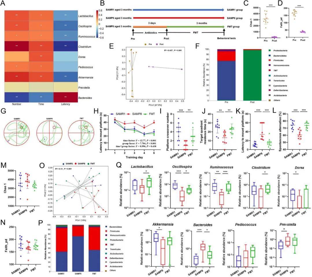 Morris水迷宮和 Y 迷宮自發交替實驗中,與SAMP8 組相比,糞菌移植3 個月后的FMT 組小鼠表現更好,包括平臺穿越次數更多、自發交替率更高等(圖 4G - L)。微生物組成上,FMT組的chao1和faith_pd指數得到恢復(圖4M-N)。PCOA分析顯著區分三組的腸道菌群組成,且FMT組與SAMR 1組更相似(圖4O),該點在門水平的注釋信息上得到印證(圖4P)。以上均表明動態變化的腸道微生物群在小鼠自然衰老期間的認知下降中起關鍵作用。