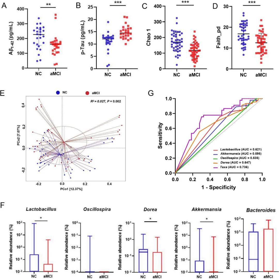 研究aMCI 患者和 NC健康對照組,發現aMCI血清中Aβ1-42水平顯著低于認知正常個體,p-Tau水平與Aβ1-42呈相反趨勢(圖5A-B)。16S測序結果中,alpha和beta多樣性分析均有顯著差異(圖5E-F)。研究發現關鍵菌群Lactobacillus、Oscillospira、kkermansia等都顯示出比單個細菌更好的辨別力(圖5G)。