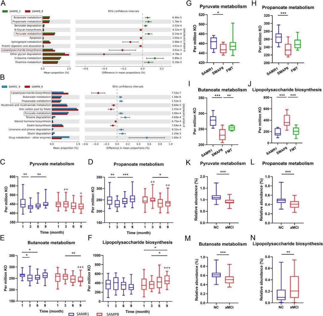 使用 PICRUSt2 預測并注釋 16S rRNA 基因功能,得到與SCFAs和LPS相關的代謝途徑豐度(6A-B),發現與SCFAs相關的代謝途徑豐度隨年齡增長而降低(圖 6C-E),LPS合成途徑的豐度在衰老過程中呈上升(圖 6F)。此外,FMT實驗中,與 SAMP8 組相比,上述代謝通路的豐度在FMT 組中得到恢復,丁酸代謝和LPS合成途徑受 FMT 的影響最顯著(圖 6G-J);分析aMCI關鍵代謝途徑的豐度(圖 6K-N),發現多個SCFAs相關途徑的豐度顯著低于NC,而LPS合成途徑顯著升高。即與SCFAs和LPS相關的代謝途徑均參與了大腦衰老過程中的認知衰退。