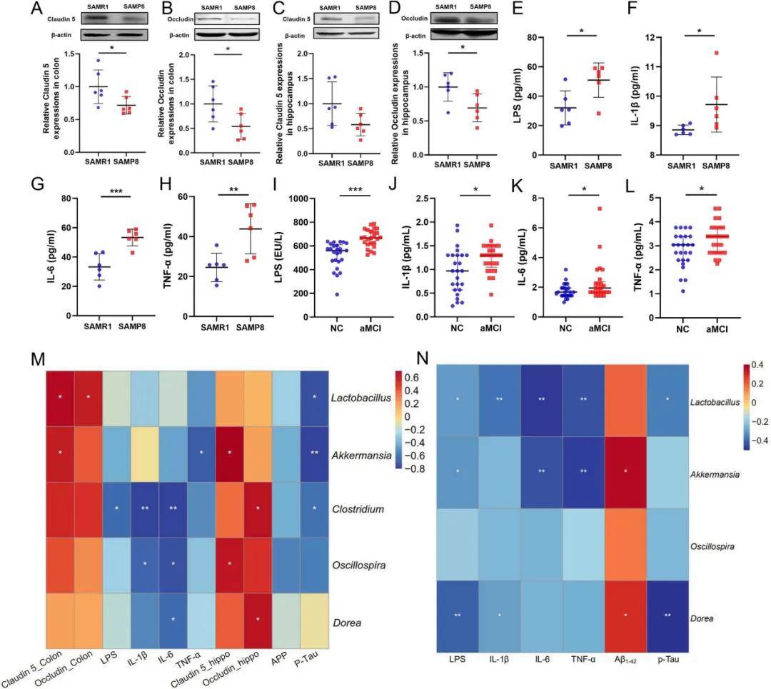 spearman分析發現, 9 月齡的 SAMR1 和 SAMP8 中,關鍵腸道細菌與結腸和海馬組織中 Claudin 5 和 Occludin 的水平呈正相關,與血清中炎癥因子水平以及海馬組織中的AD病樣病理特征呈負相關。人類的關鍵腸道菌群與血清中 β 淀粉樣蛋白 1-42(Aβ1-42)水平呈正相關,與LPS、IL-1β、IL-6、TNF-α 和磷酸化 tau 蛋白(p-Tau)水平呈負相關。即關鍵腸道細菌群與腸道屏障完整性、慢性全身炎癥、血腦屏障完整性以及阿爾茨海默病樣病理特征相關。(圖 7M-N)