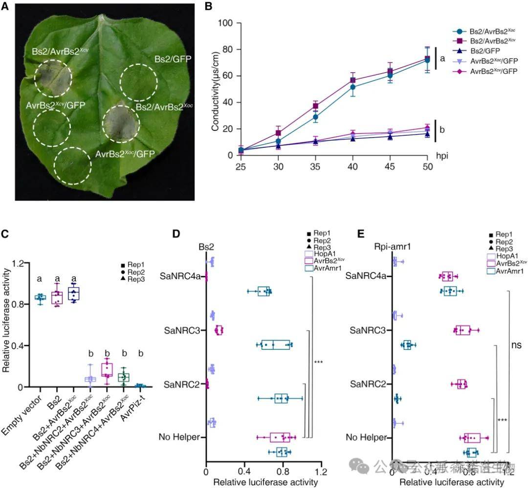 水稻原生質體瞬時表達螢光素酶(LUC)實驗證明說明Bs2對AvrBs2Xoc的識別需要輔助型NLR的幫助(圖1C)。此外在大豆原生質體的LUC實驗證實Bs2和SaNRC2、SaNRC3、SaNRC4a共轉可抑制LUC活性,Rpi-amr1和SaNRC2、SaNRC3共轉可抑制LUC活性,但和SaNRC4a共轉不可抑制LUC活性(圖1D-E)